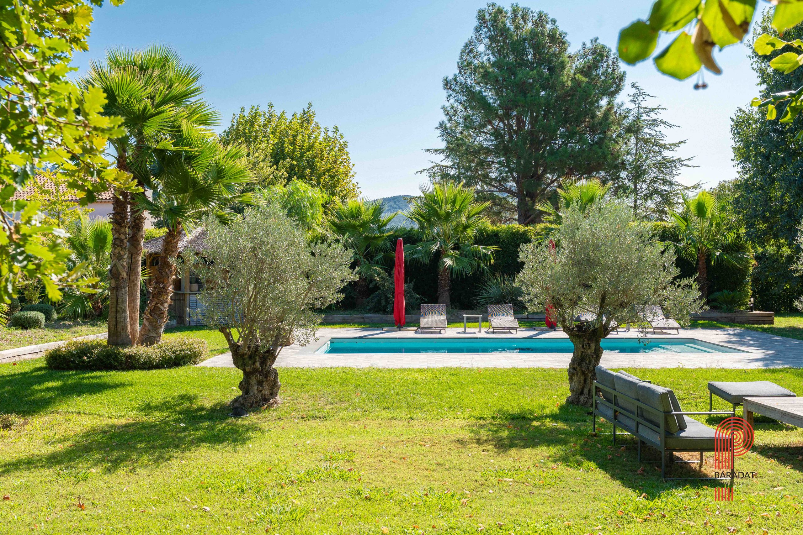 L’aménagement paysager, soigneusement pensé, mêle arbres fruitiers, palmiers et sujets centenaires.