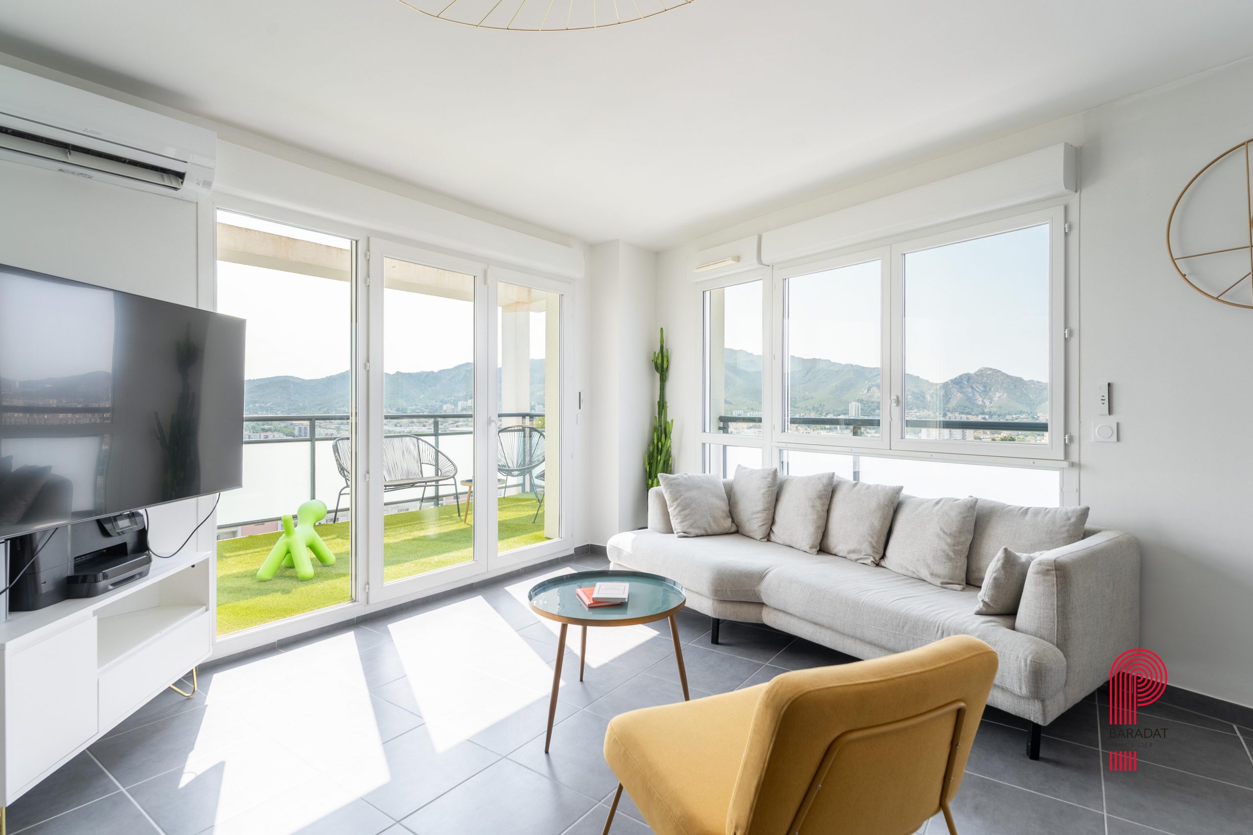 La pièce à vivre, baignée de lumière, profite d’une vue mer et ville spectaculaire et s’ouvre sur une terrasse de 11 m². La lumière naturelle y est omniprésente, renforçant encore l’impression d’espace. Grâce à sa position élevée, cet appartement offre une intimité absolue, à l’abri de tout vis-à-vis.