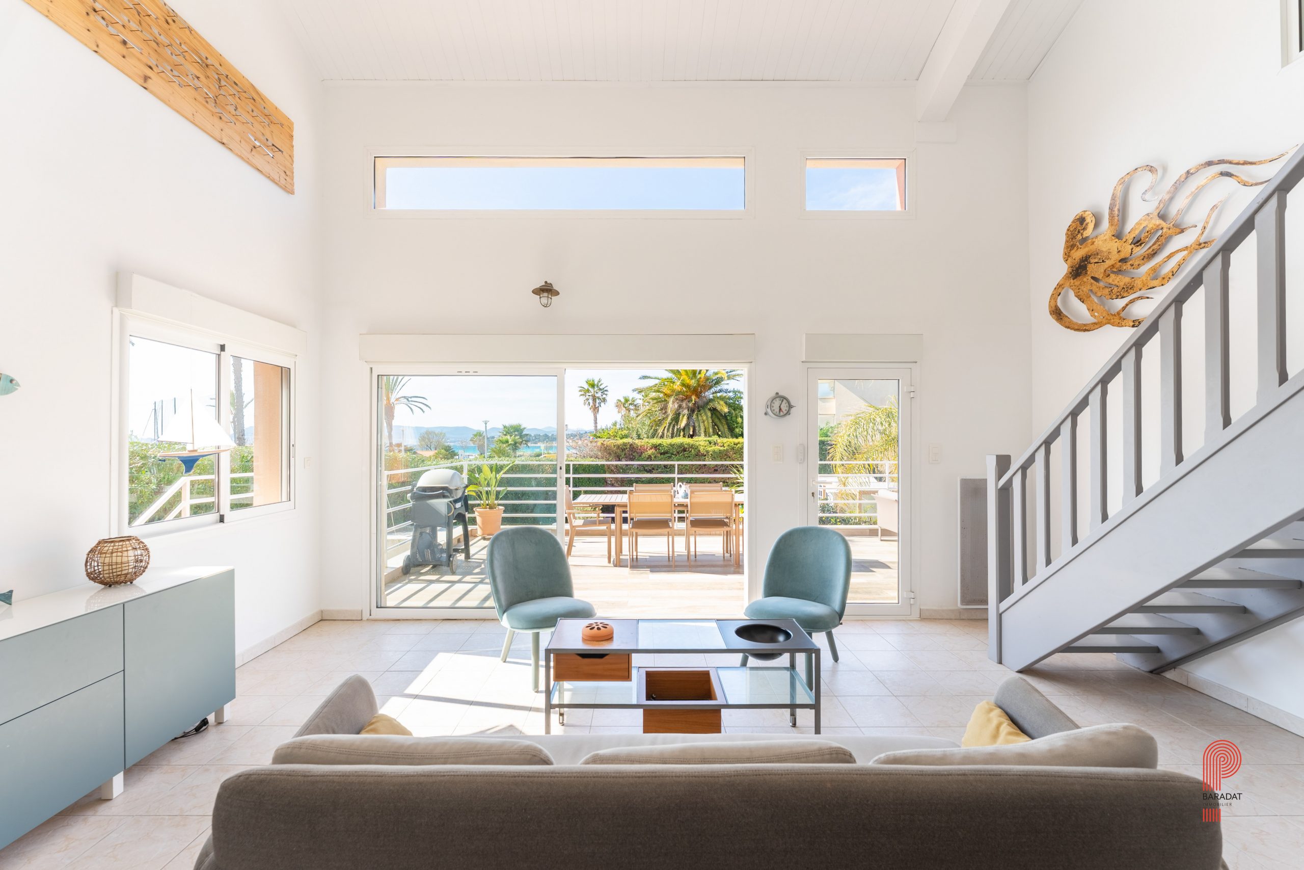 EXCLUSIVITÉ – VUE MER – Idéalement situé face à la grande plage des Lecques, ce duplex de 128 m² (115 m² loi Carrez) est un des 3 lots d’une maison contemporaine, érigée en 2003 en front de mer. Ce bien exposé Ouest bénéficie d’une terrasse principale de 36 m², ainsi que d’une terrasse supplémentaire de 9 m². Son architecture et ses lignes rappellent les codes nautiques. Elle s’intègre harmonieusement dans son environnement côtier. L’appartement se déploie sur deux niveaux : Quelques marches mènent à un vaste espace de vie de 40 m² qui s’ouvre sur la terrasse offrant une vue sur la mer. La grande hauteur sous plafond confère à cette pièce de vie toute sa singularité. Ce niveau comprend également deux chambres, l’une d’elles bénéficiant d’un accès direct à l’extérieur. À l’étage, deux chambres supplémentaires partagent une seconde salle de bain, garantissant à l’ensemble de la famille un confort optimal. La copropriété bénéficie d’un emplacement privilégié, face à la mer, à quelques pas des commerces tout en étant préservée des nuisances sonores, assurant ainsi un cadre de vie agréable et serein tout au long de l’année. Ce bien est complété par trois places de parking privatives. Charges annuelles : 1 081 €. Taxe foncière : 2 570 €. Classe énergétique : D/B. Plus d’informations sur www.georisques.gouv.fr. Non détention de fonds. Mandat N° 154.