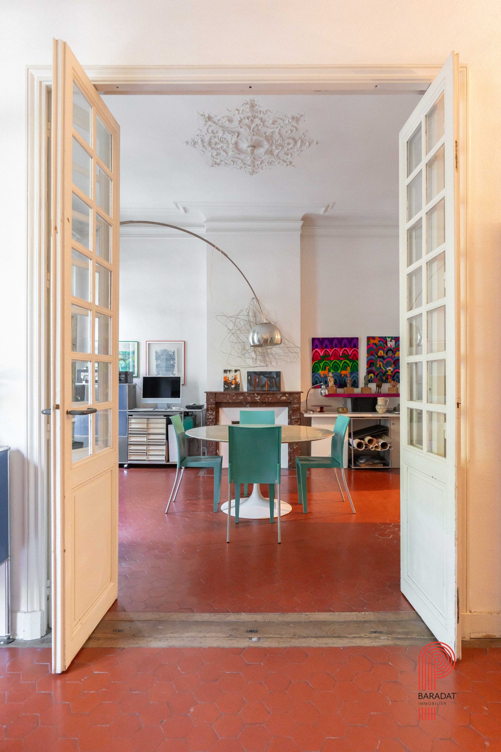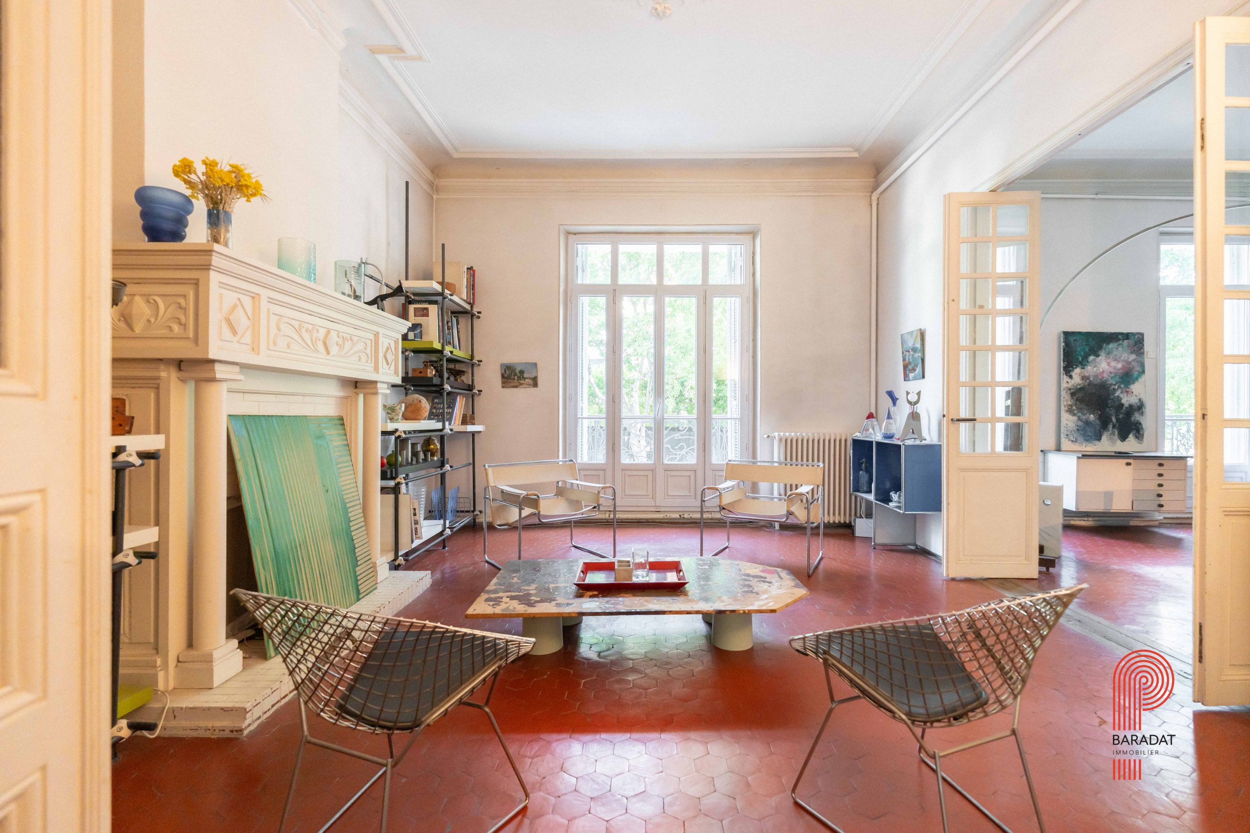 Les volumes sont généreux et les éléments d’origine ont été conservés : tomettes, parquet, moulures, cheminées. Le séjour et la salle à manger sont séparés par une grande porte pliante, permettant d’unifier les deux pièces selon vos envies.
