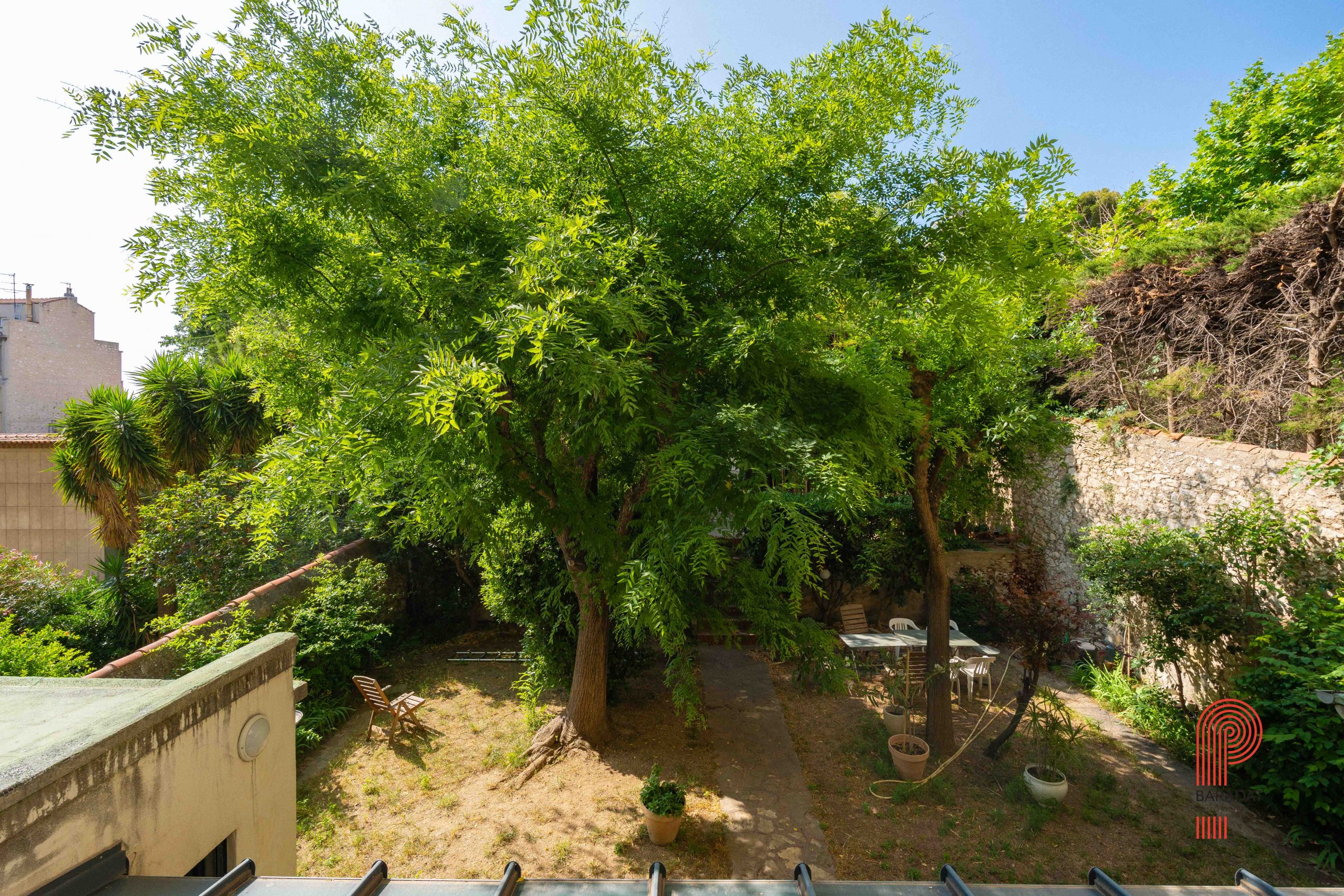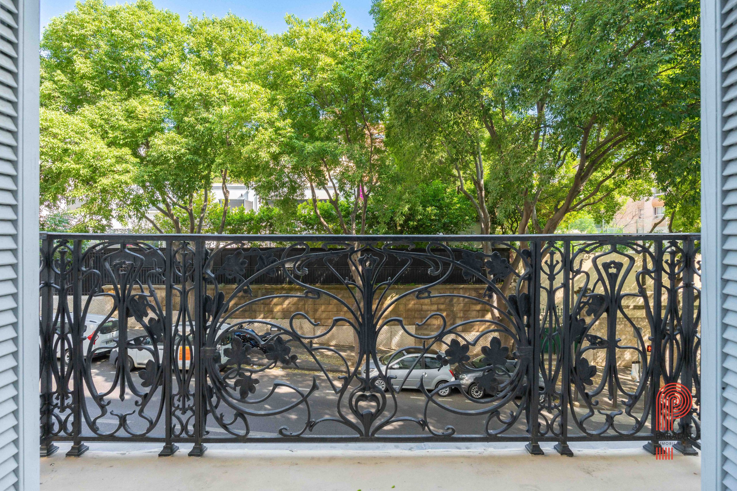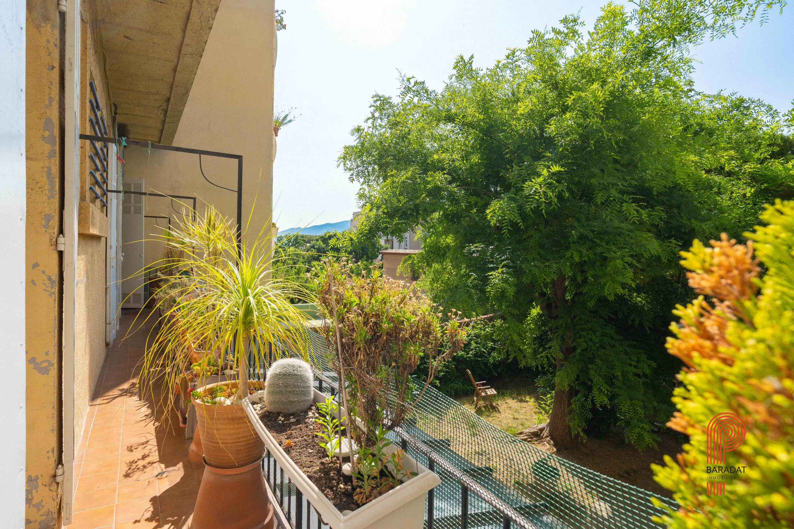 Un grand balcon filant de 13 m², exposé plein sud, offre une vue dégagée sur un cadre verdoyant et un calme absolu, en surplomb d’un vaste jardin privé.