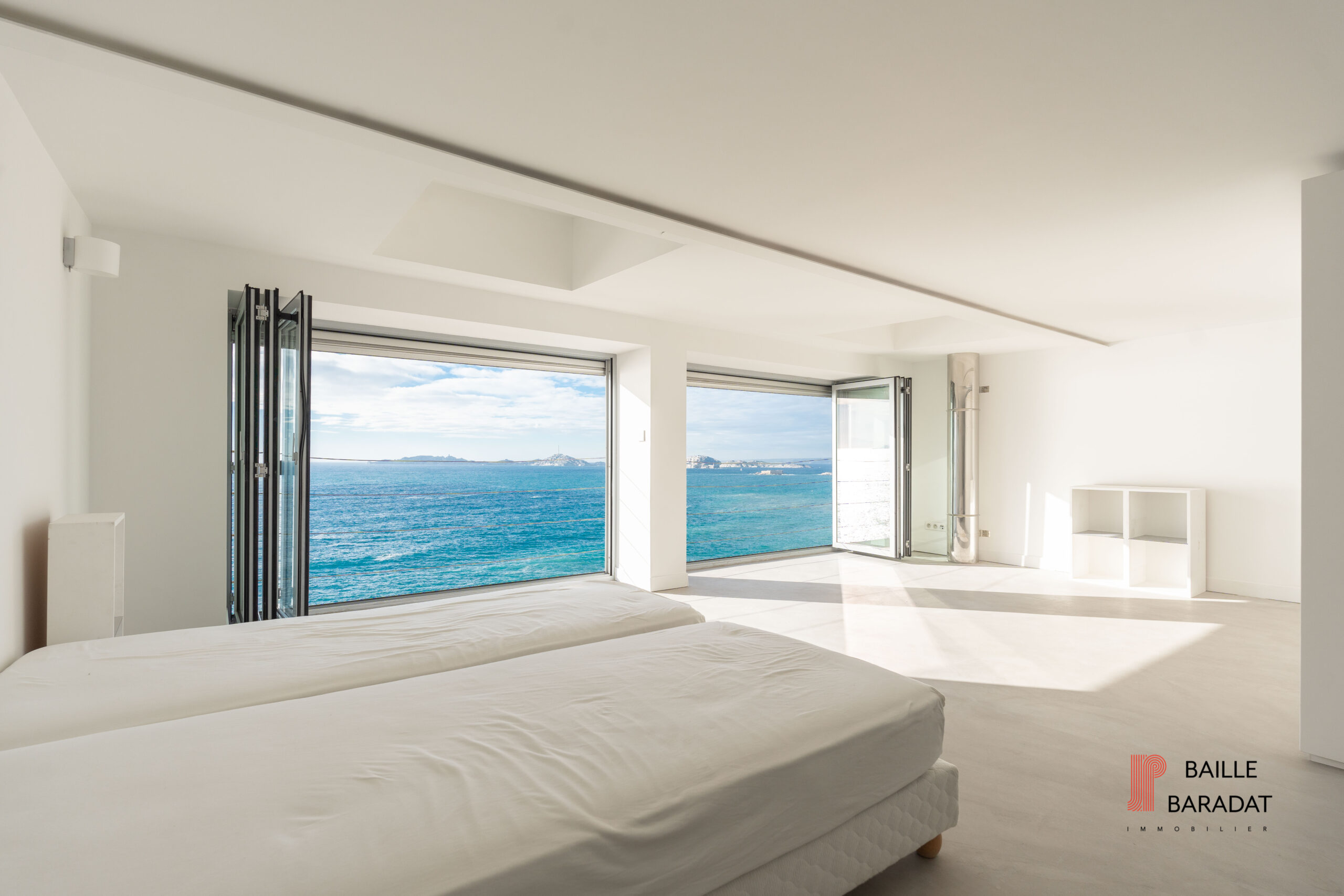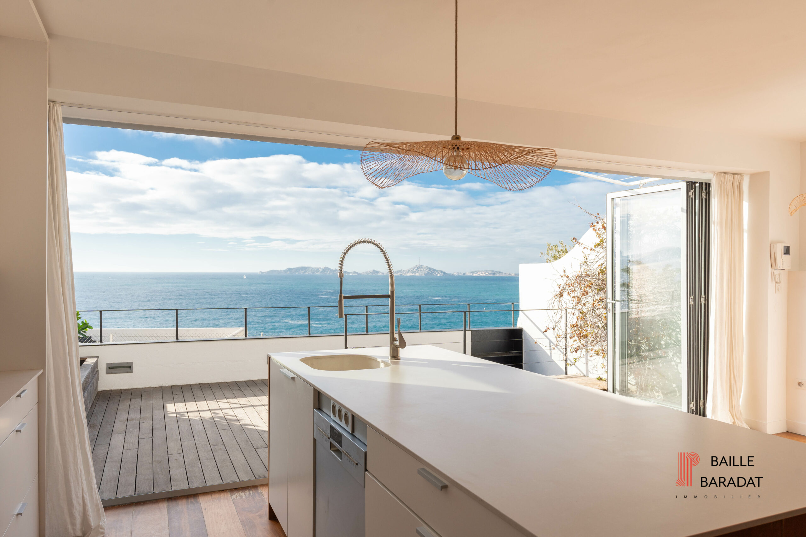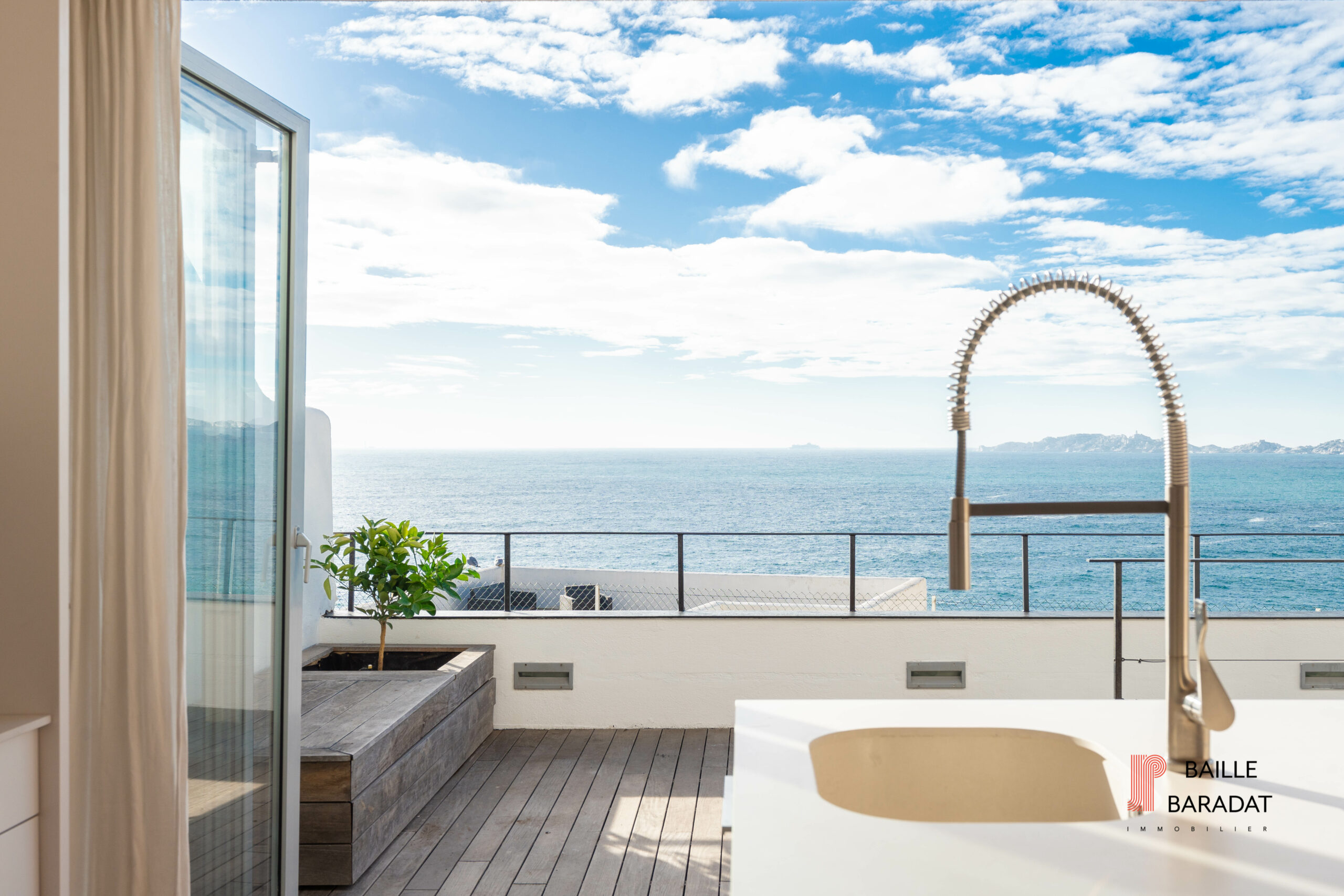 Exclusivité – Idéalement située dans le quartier du Roucas-Blanc, cette maison de 133 m² bénéficie d’une vue exceptionnelle sur la mer. Accessible à pied par un escalier, elle surplombe la corniche et la plage du Prophète. Toutes les pièces sont orientées vers la mer, avec pour toile de fond l’île Maire, l’île De Planier, Le Frioul et le Château d’If, créant une atmosphère unique, comme posé sur l’eau. Au premier niveau, se trouve une spacieuse pièce à vivre de 53 m² agrémentée d’une cuisine moderne et d’une cheminée au design contemporain. Les larges baies vitrées en accordéon s’effacent complétement prolongeant l’espace de vie vers une terrasse ensoleillée et sans vis-à-vis de 20 m². Le deuxième niveau abrite une suite parentale complète avec dressing, salle de bain et douche, ainsi qu’une deuxième terrasse de 18 m². Au dernier étage, une salle d’eau et une grande chambre de 33 m² offrent une flexibilité d’aménagement, pouvant être facilement divisée par une cloison pour créer une troisième chambre ou un bureau. En parfait état, cette propriété ne nécessite aucuns travaux. Les nombreux rangements, matériaux et équipements de qualité assurent un confort optimal. Une cave de 12 m² complète la description et un box motorisé est disponible en location. Taxe foncière : 2300 €. Mandat exclusif numéro 106. Honoraires à la charge du vendeur. DPE : C/B. Non-détention de fonds. Contact : Mathieu PONCHIN 0624050026. www.géorisques.gouv.fr.