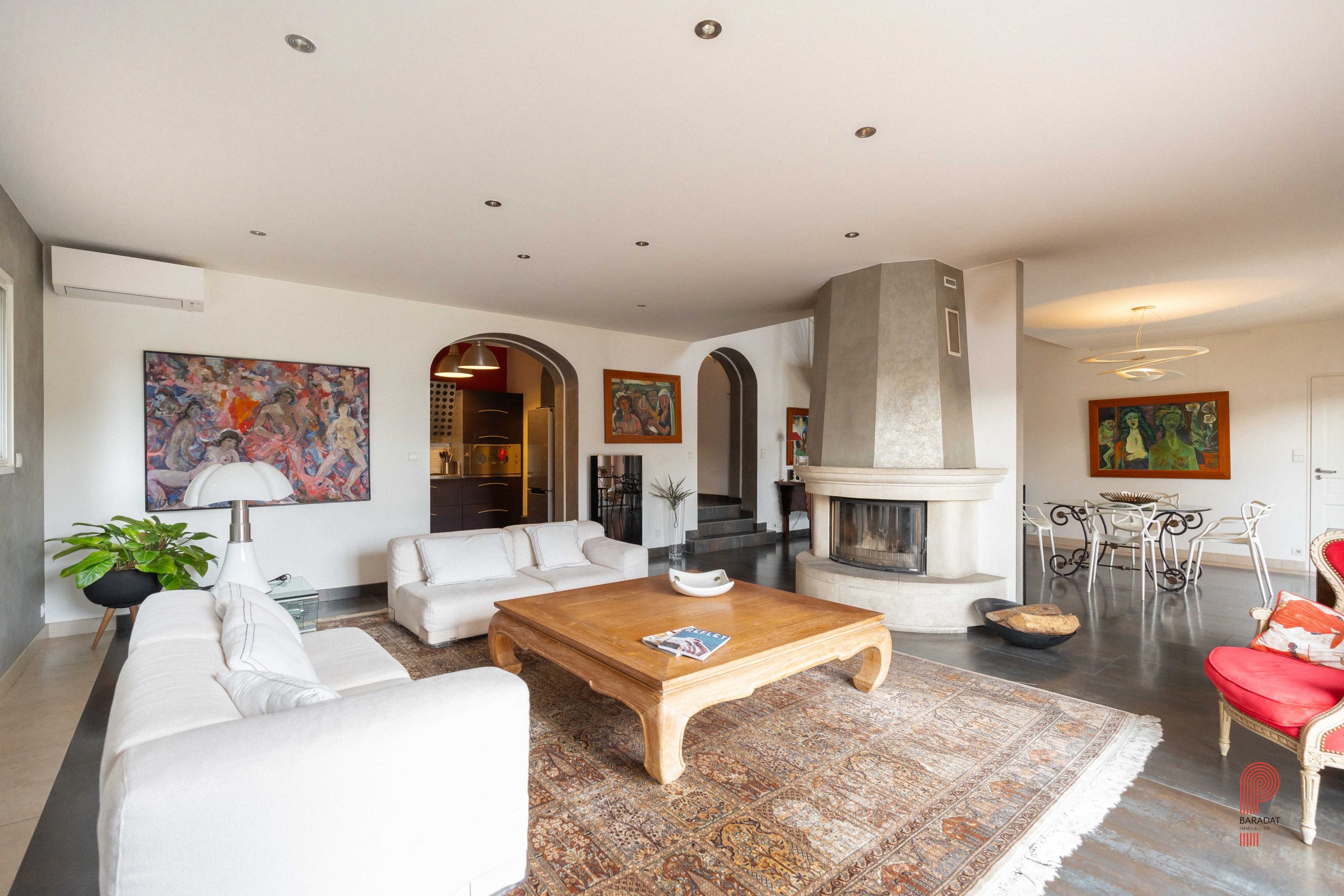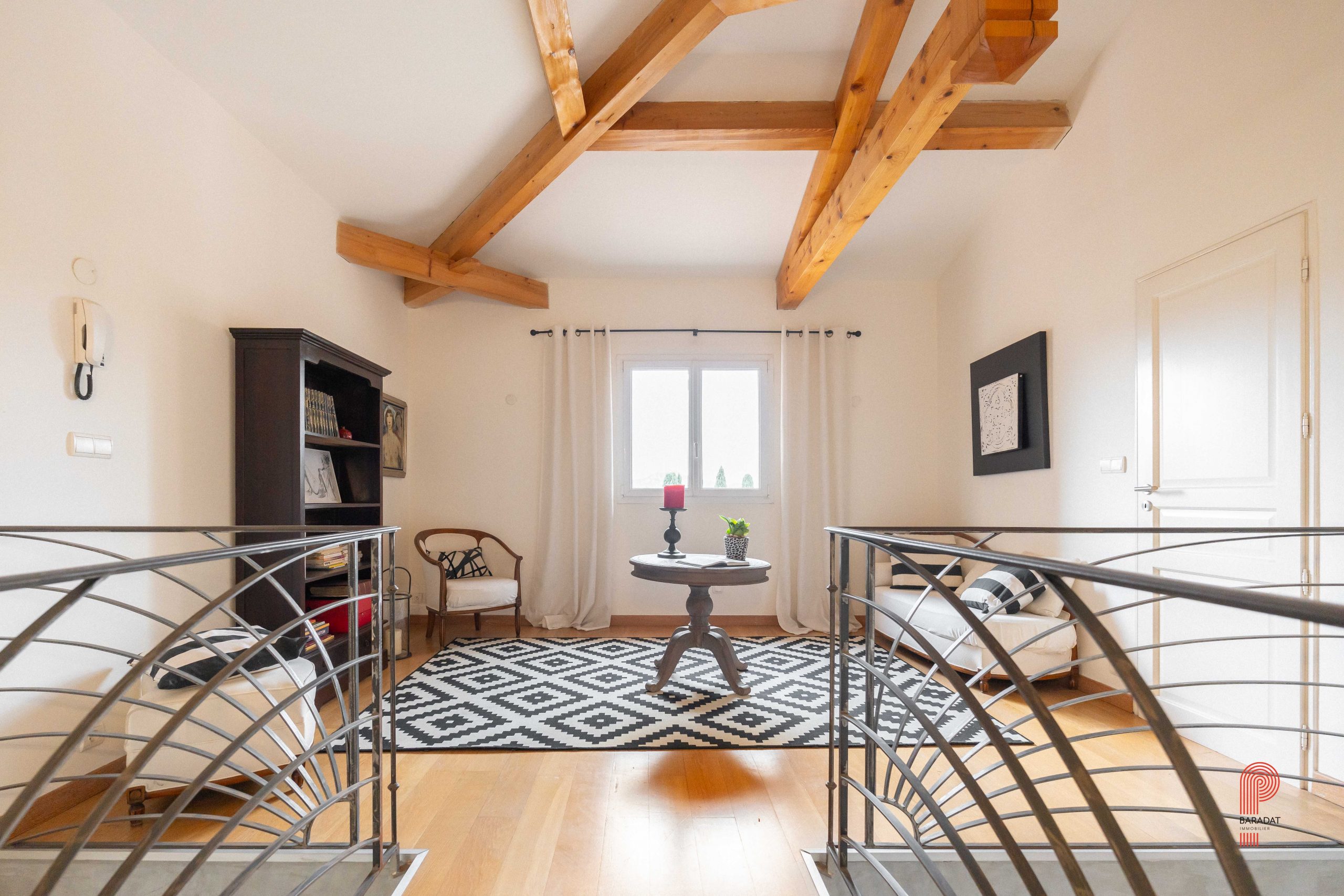 À l’intérieur, les volumes généreux sont baignés de lumière. La pièce à vivre de 60 m² se compose d’un salon et d’une salle à manger agrémentés d’une belle cheminée en pierre communiquant avec une la cuisine équipée. La partie en salon cathédrale, avec ses poutres apparentes et sa charpente imposante, renforce le caractère unique de cette maison. Une grande suite parentale de plain-pied s’ouvre directement sur le jardin, offrant confort et intimité. Un escalier élégant mène à l’étage, où un coin lecture/bureau et deux chambres offrent une vue dégagée sur les collines environnantes.