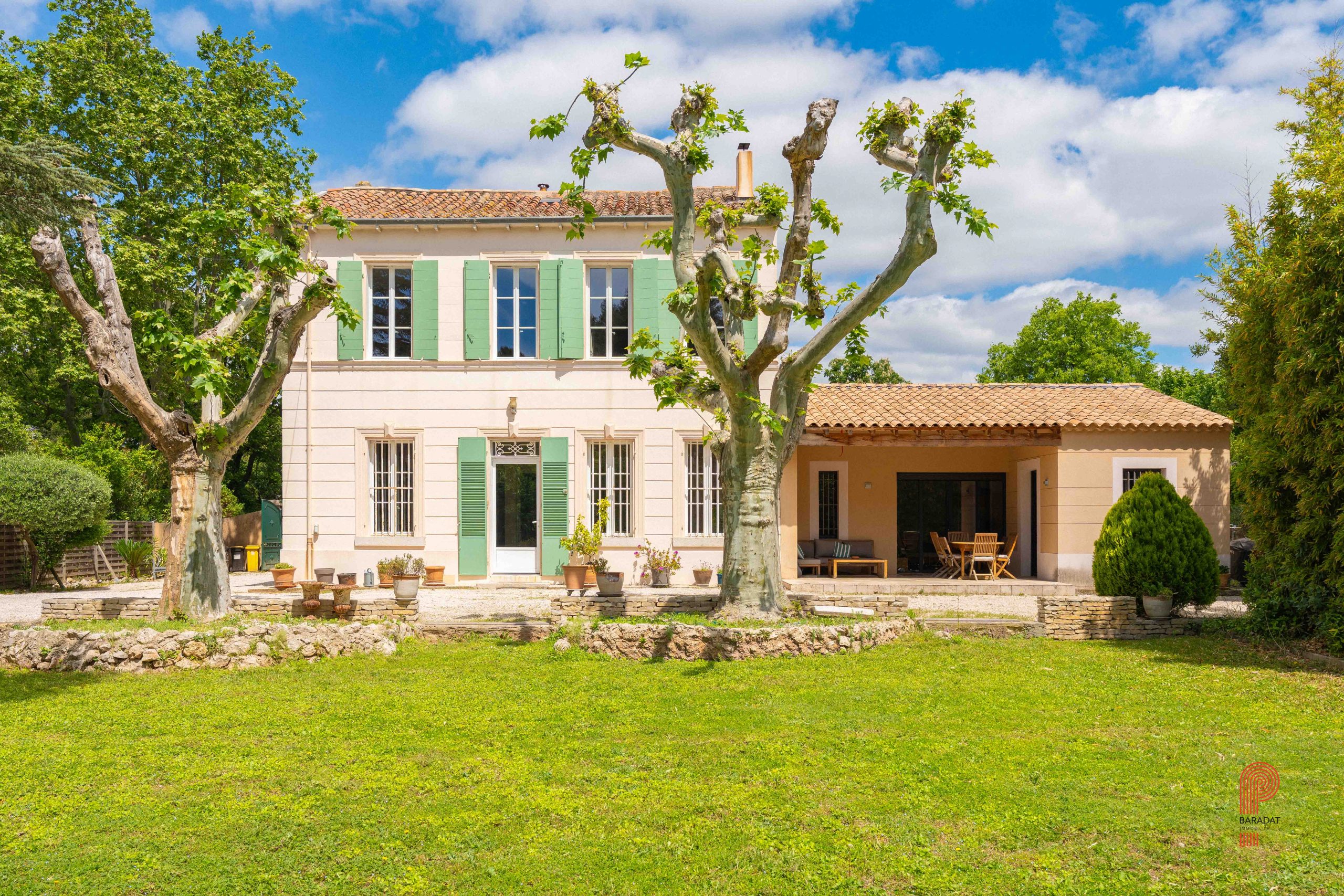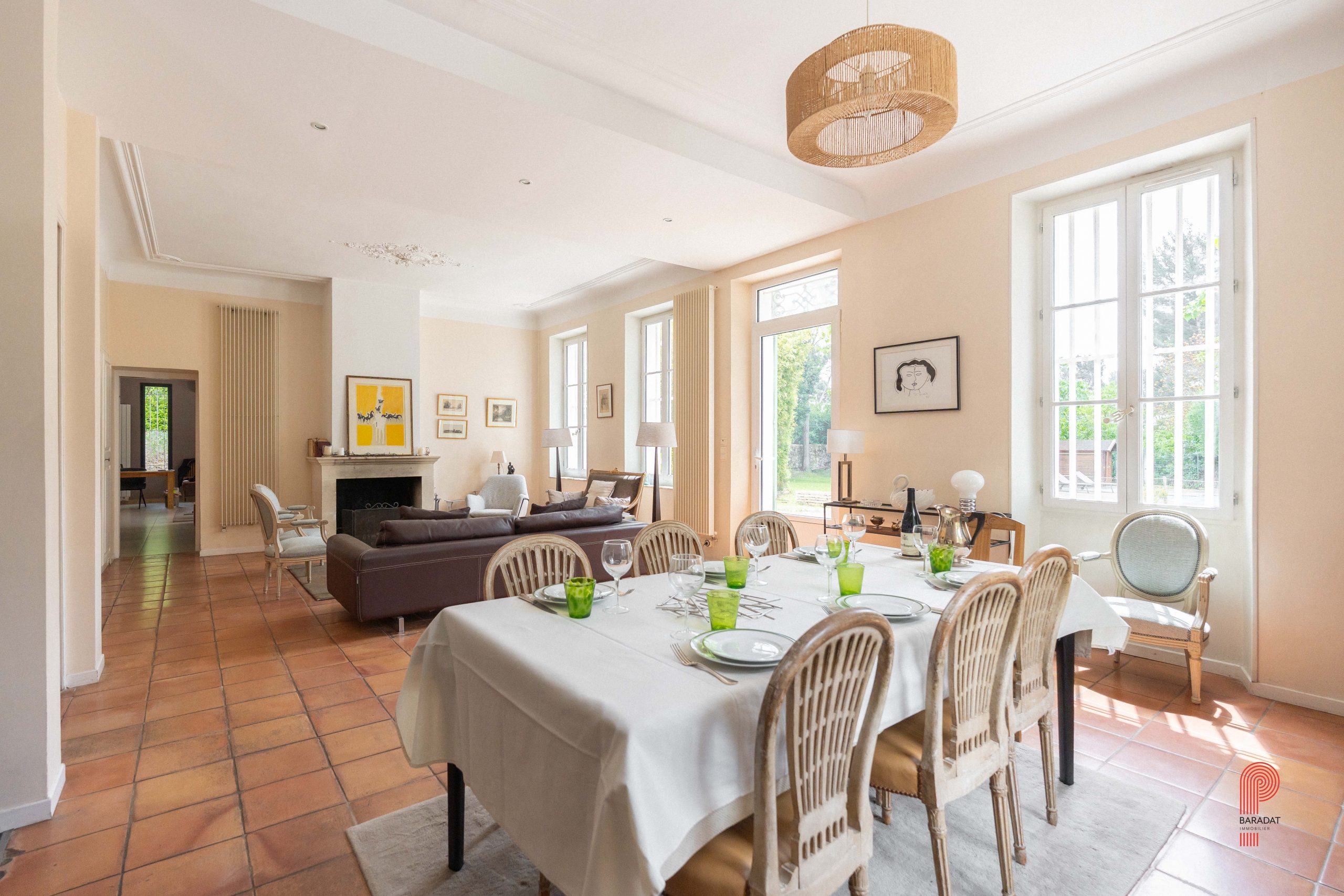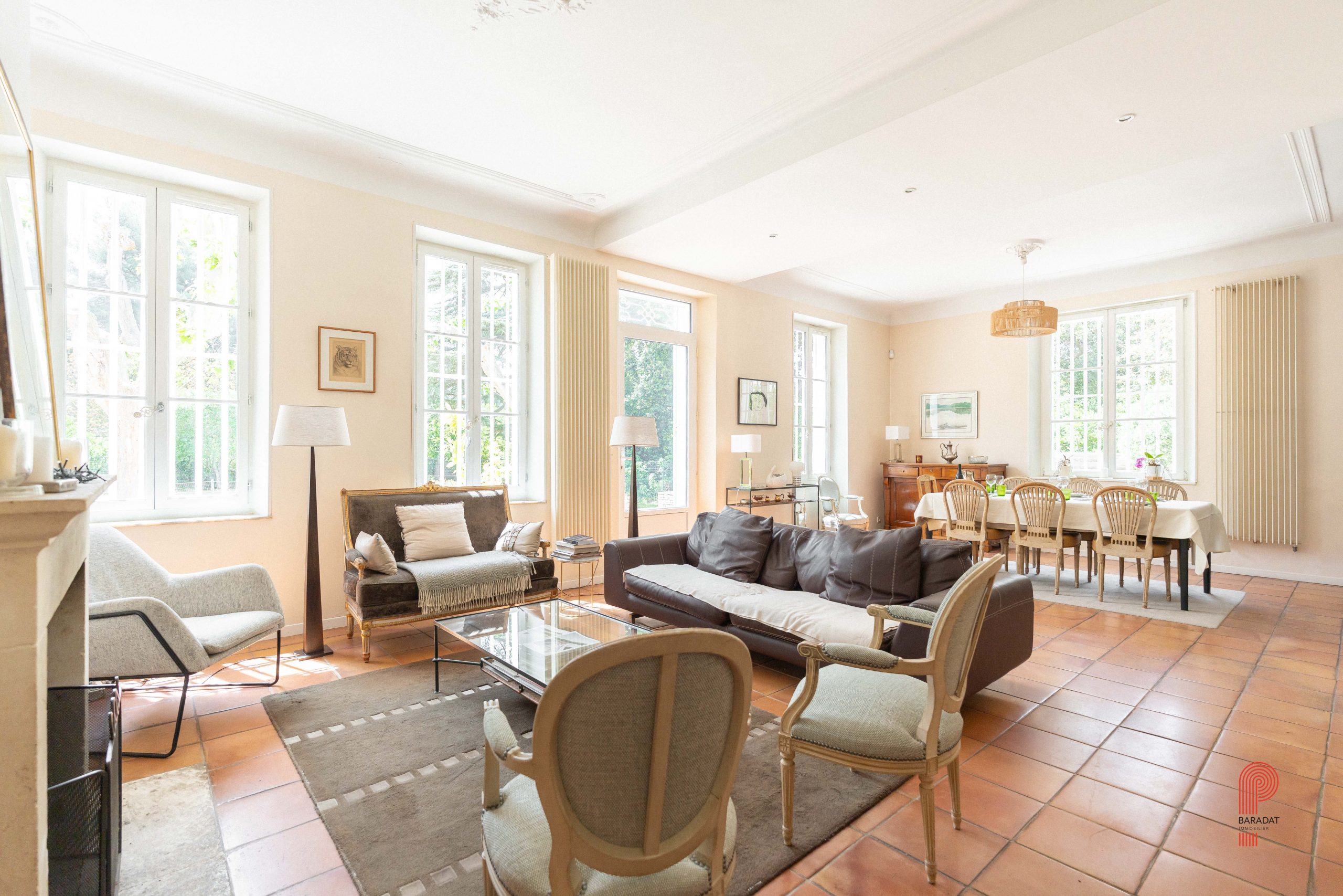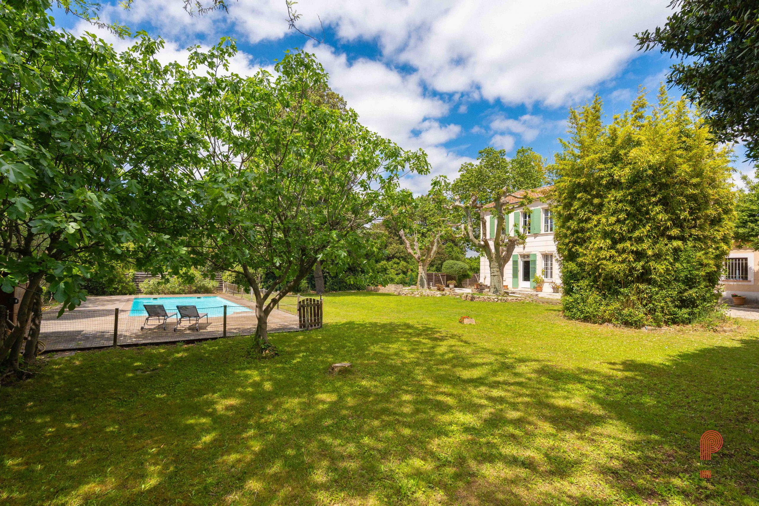 Implantée sur un terrain paysager de 1 700 m², sans aucun vis-à-vis et bordée par une zone verte inconstructible, la demeure principale offre environ 250 m² habitables. Elle comprend cinq chambres ainsi qu’un vaste bureau de 32 m². La pièce de vie, d’une superficie de 62 m², a conservé ses moulures, sa belle hauteur sous plafond et une élégante cheminée à foyer ouvert. Orientée plein sud, elle bénéficie d’une luminosité généreuse tout au long de la journée, de volumes spacieux et d’une extension plus récente qui crée un contraste harmonieux avec la bâtisse d’origine.