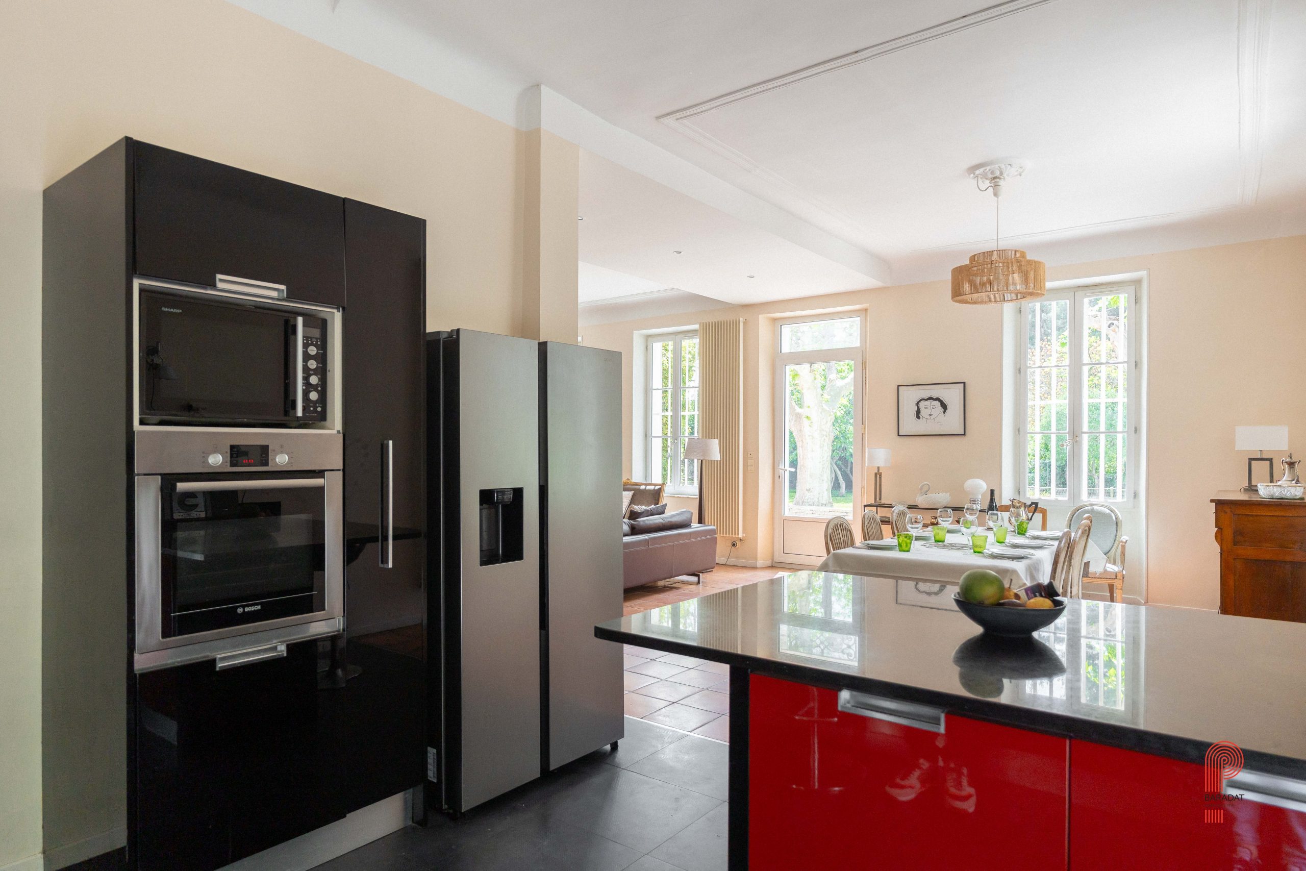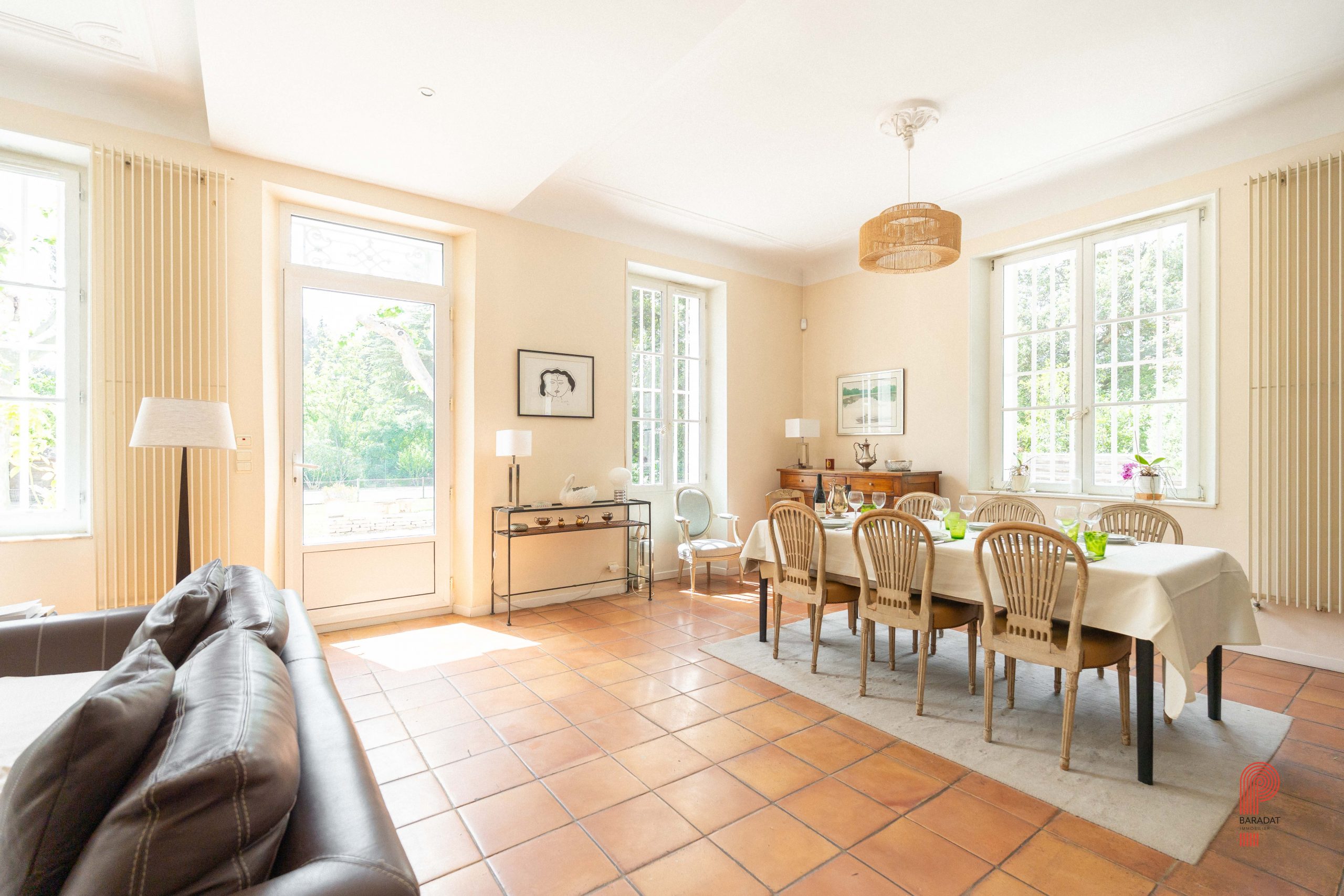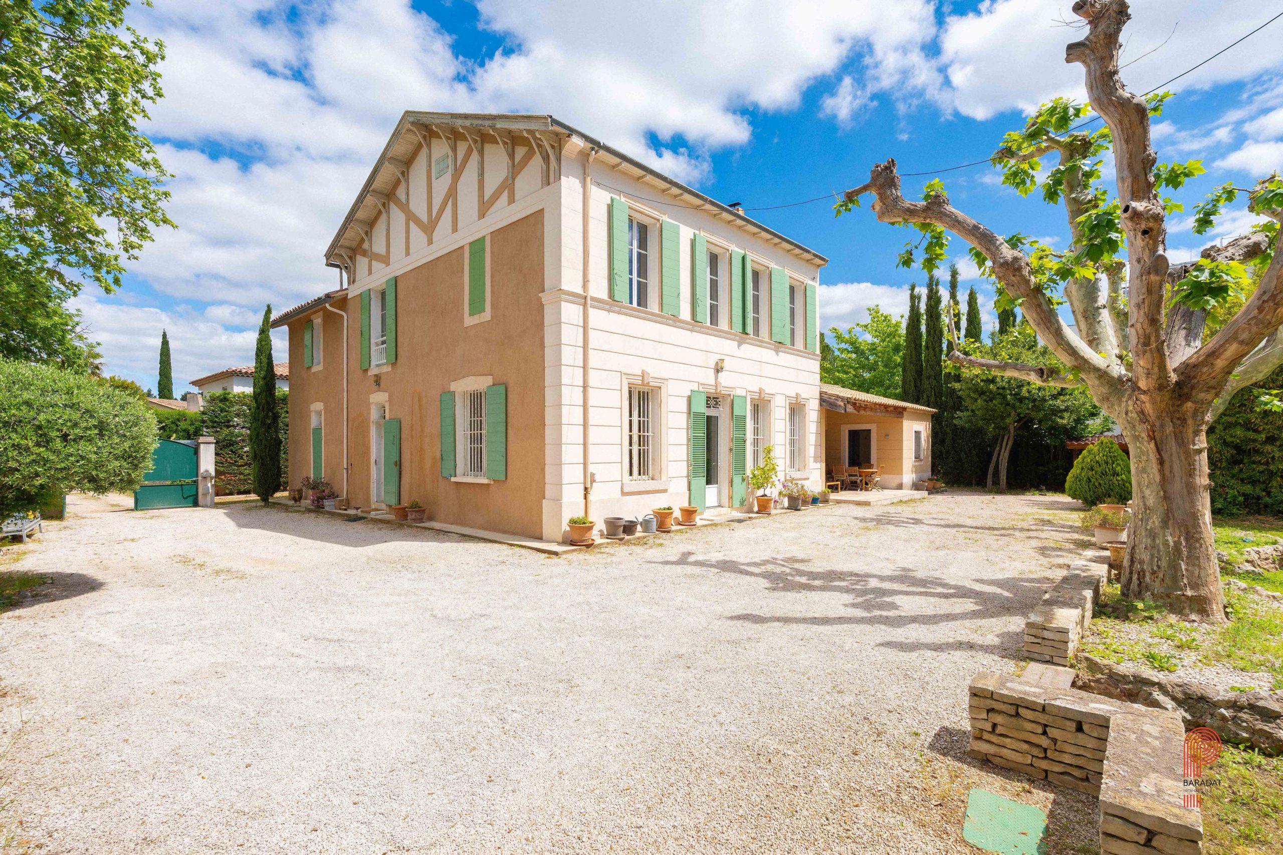 Implantée sur un terrain paysager de 1 700 m², sans aucun vis-à-vis et bordée par une zone verte inconstructible, la demeure principale offre environ 250 m² habitables. Elle comprend cinq chambres ainsi qu’un vaste bureau de 32 m². La pièce de vie, d’une superficie de 62 m², a conservé ses moulures, sa belle hauteur sous plafond et une élégante cheminée à foyer ouvert. Orientée plein sud, elle bénéficie d’une luminosité généreuse tout au long de la journée, de volumes spacieux et d’une extension plus récente qui crée un contraste harmonieux avec la bâtisse d’origine.